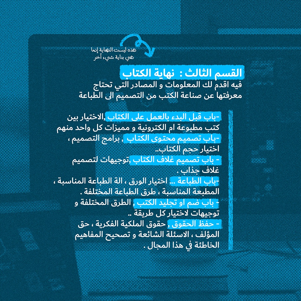 -باب قبل البدء بالعمل على الكتاب , الاختيار بين كتب مطبوعة ام الكترونية و مميزات كل واحد منهم -باب تصميم محتوى الكتاب برامج التصميم ، اختيار حجم الكتاب..