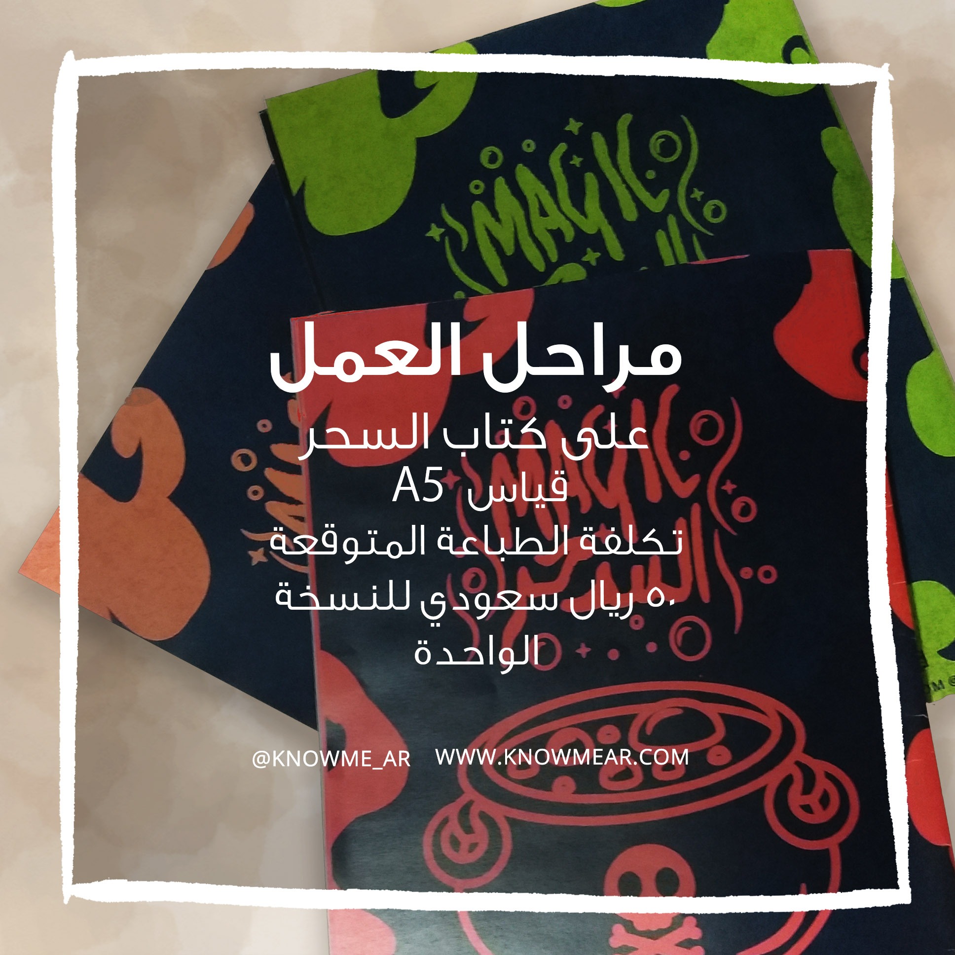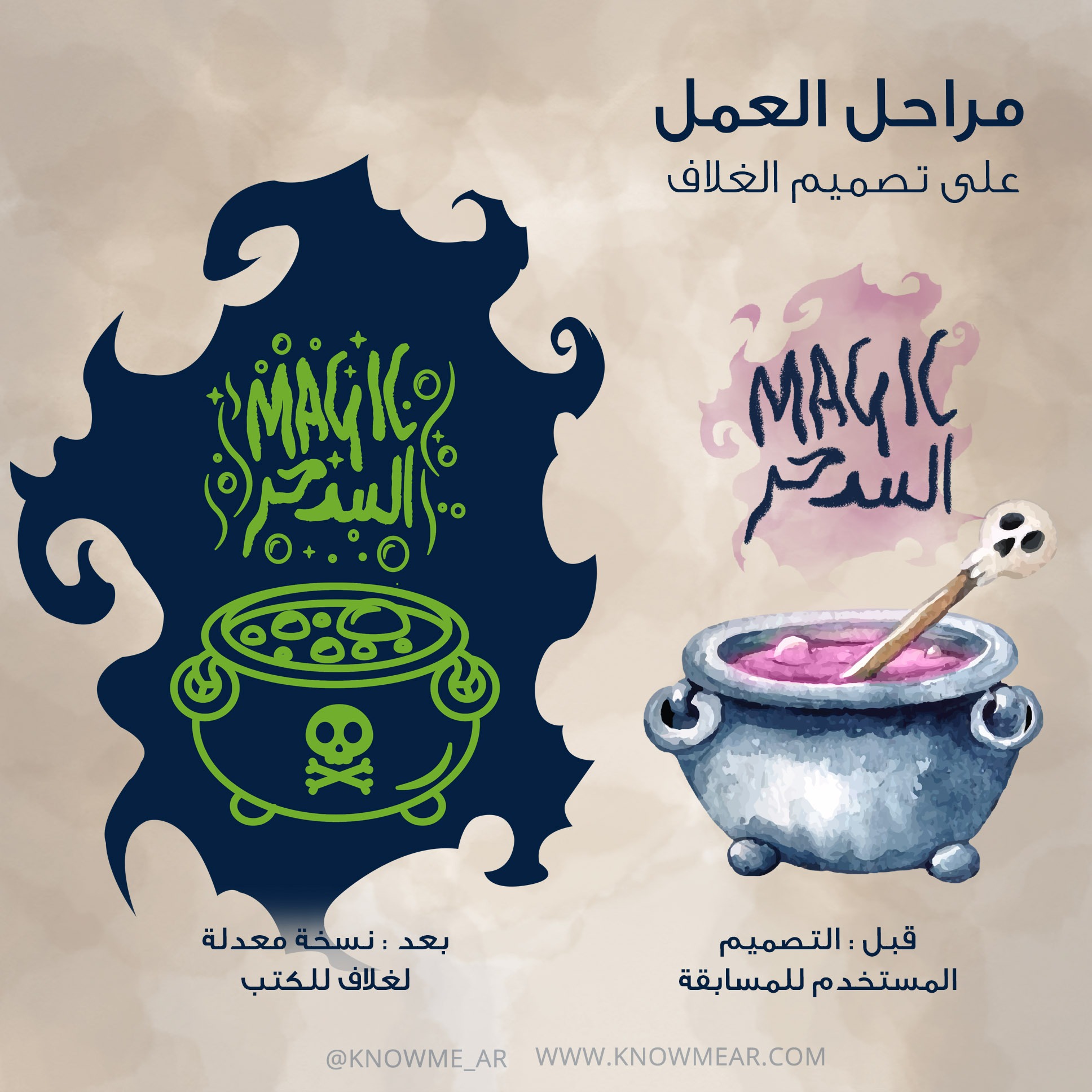 مبني على تصميم نشرات المسابقة كلمة ماجيك و سحر مكتوبين بخط اليد منذ البداية ، الصور المستخدمة بالنشرات مثل القدر و القبعة كانت جاهزة قمت بشرائها مسبقا من Freepik لكنني لم ارد استخدامها في غلاف الكتاب لانني اردت مظهر متجدد لذا قمت باعادة رسم القدر ليتناسب مع ما اريده واضفت لمسات بسيطة لكلمة سحر بالرغم من بساطته الا انني لم اتوصل لفكرته الا بعد يوم من التجارب